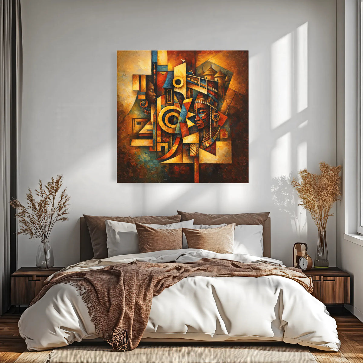 What sets this piece apart is its ability to connect with viewers on an emotional level. The abstract design, with its bold geometric shapes and warm hues, invites you to explore its depths and discover new meanings with each glance. It's a conversation starter, a focal point, and a testament to the power of art to transcend boundaries.