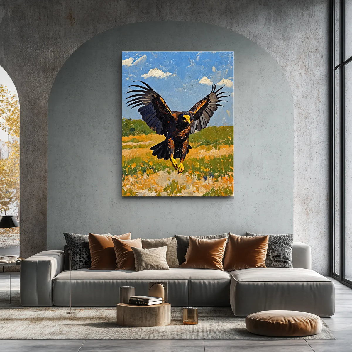 What truly sets the "Golden Talons Eagle" print apart is its exceptional quality, ensuring you receive a piece of art that looks and feels premium without the premium price tag. This giclée print utilizes advanced inkjet technology to reproduce art with incredible precision, offering a wider color gamut and exceptional depth of detail that rivals original paintings. We use museum-quality polycotton canvas, available in a robust 380gsm or an even more substantial 410gsm weight. This special canvas material ensures your print is not only durable but also displays colors with incredible vibrancy and accuracy, making the eagle's golden talons and the verdant grassland come alive with unparalleled realism.