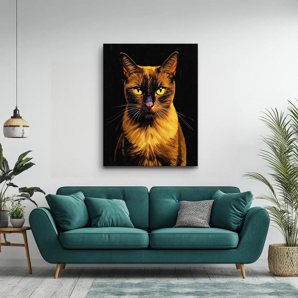 Prepare to be enchanted by the striking presence of the Shadowy Siamese Cat Giclée Print 456051. This stunning piece of art captures the enigmatic allure of a Siamese cat, rendered with breathtaking detail and vibrant color. Imagine its piercing, luminous yellow eyes drawing you in, set against a dramatic, shadowy background that makes the cat's rich, golden-brown coat truly pop. The textured brushstrokes, faithfully reproduced through Giclée printing, give the artwork a sense of depth and life, making it appear as though the cat could leap right off the canvas. This is more than just a picture; it's an instant mood-setter, infusing your space with a sophisticated and captivating ambiance. Perfect for cat lovers, art enthusiasts, or anyone seeking to add a touch of unique character to their home or office, this print offers an amazing visual experience that will be admired for years to come.