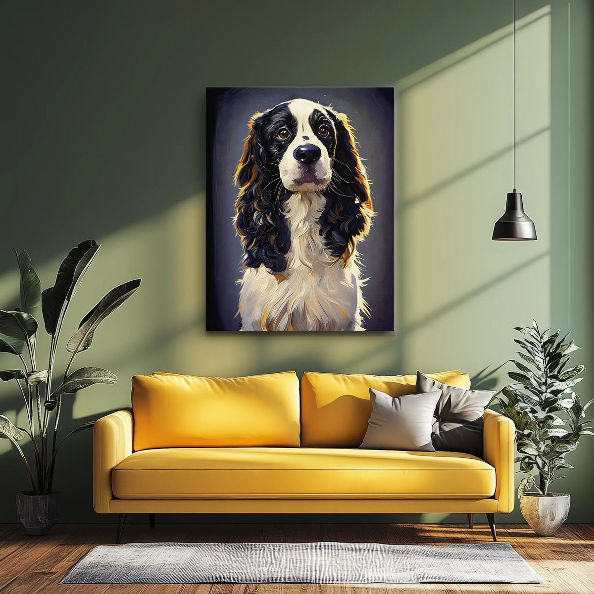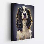This Exclusive Springer Spaniel's Soft Stare Giclée Print 456054 captures a tender, soulful moment that every dog lover will recognize at once. The image shows a beautiful black-and-white Springer Spaniel, ears softly curled and eyes full of gentle curiosity, against a deep, calming background. The rich brushstroke effect and lifelike detail make it feel as if this loyal friend is watching over your room, bringing comfort, joy, and a sense of home the instant you hang it on your wall.