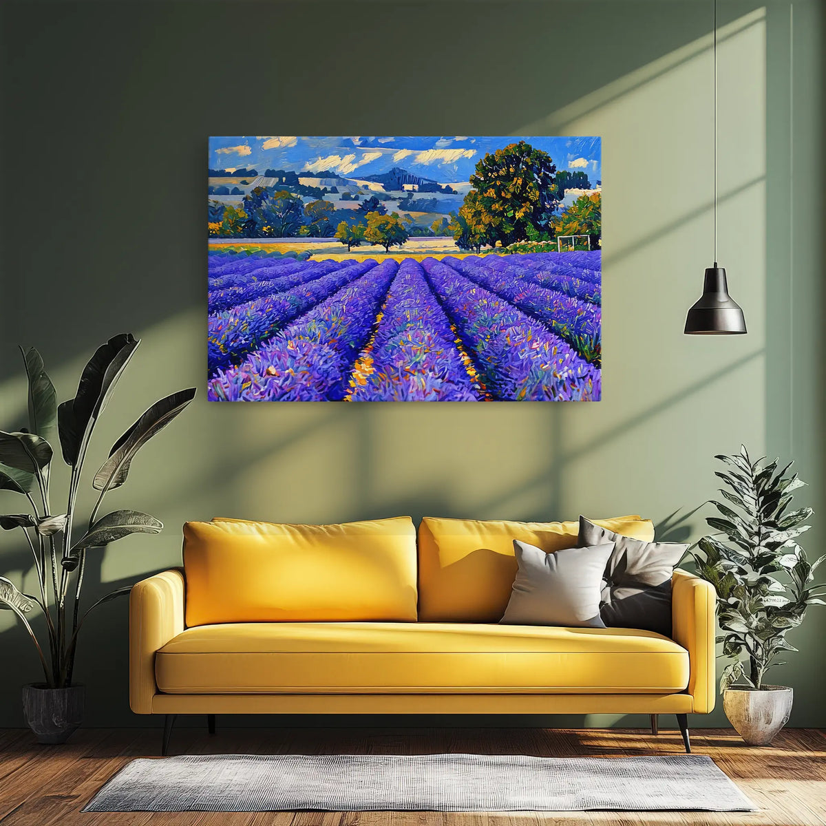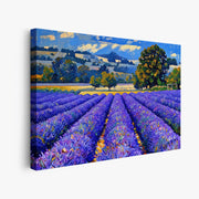 Immerse yourself in the breathtaking beauty of the French countryside with the Lavender Field Landscape Giclée Print 323026. This stunning piece of art instantly transports you to a vibrant, sun-drenched panorama where endless rows of purple lavender stretch towards the horizon. The striking visual, crafted with broad, confident strokes, captures the essence of a peaceful afternoon, with warm yellow fields in the midground, gentle hills fading into the distance, and a brilliant blue sky dotted with soft, impressionistic clouds. It’s more than just an image; it’s a window to a tranquil escape, promising to infuse any room with color, calm, and sophisticated charm.