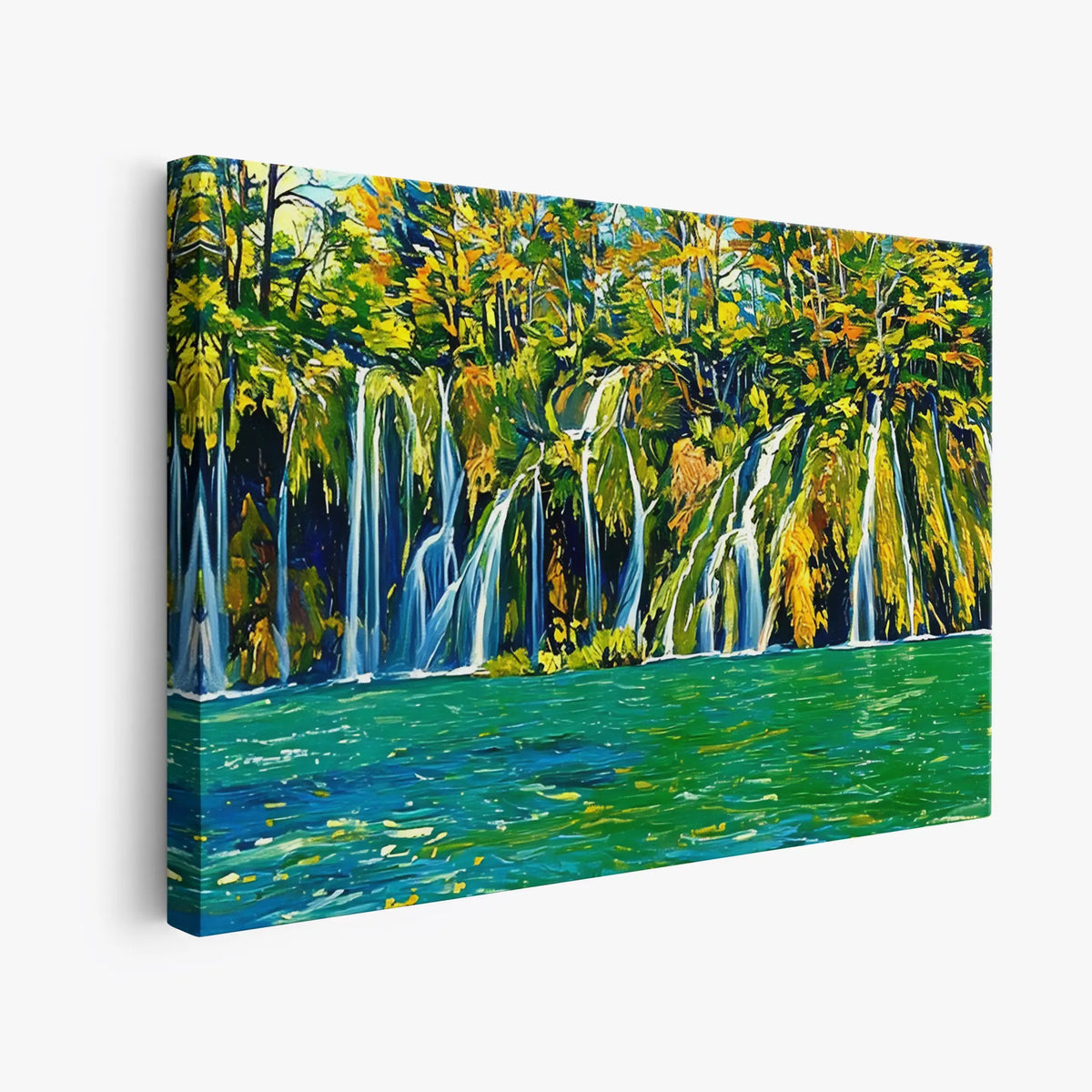 Immerse yourself in a vibrant natural escape with the Multitude of Waterfalls Giclée Print 323036. This Exclusive artwork captures a lush forest bursting with emerald greens, sunlit yellows, and deep blues, all cascading into a crystal-clear turquoise pool. The painting’s expressive brushstrokes and rich color palette instantly transport you to a serene waterfall haven, turning any blank wall into a breathtaking view.