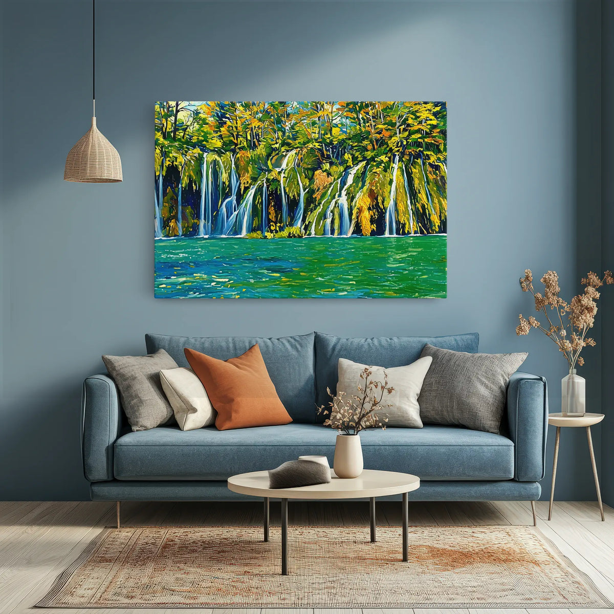 This Amazing piece is produced as a high-quality giclée print on museum-grade polycotton canvas, weighing between 380gsm and 410gsm. In simple terms, that means the canvas is thick, durable, and built to last, while the fine ink droplets capture every nuance of color and texture from the original artwork. The result is a vivid, true-to-life print that resists fading, so your waterfall paradise stays brilliant year after year.