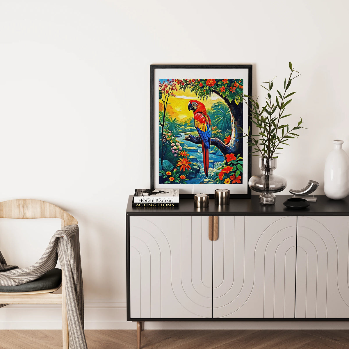 This amazing artwork captures a Scarlet Macaw perched above a lush jungle stream, surrounded by bright flowers and glowing sunset skies.