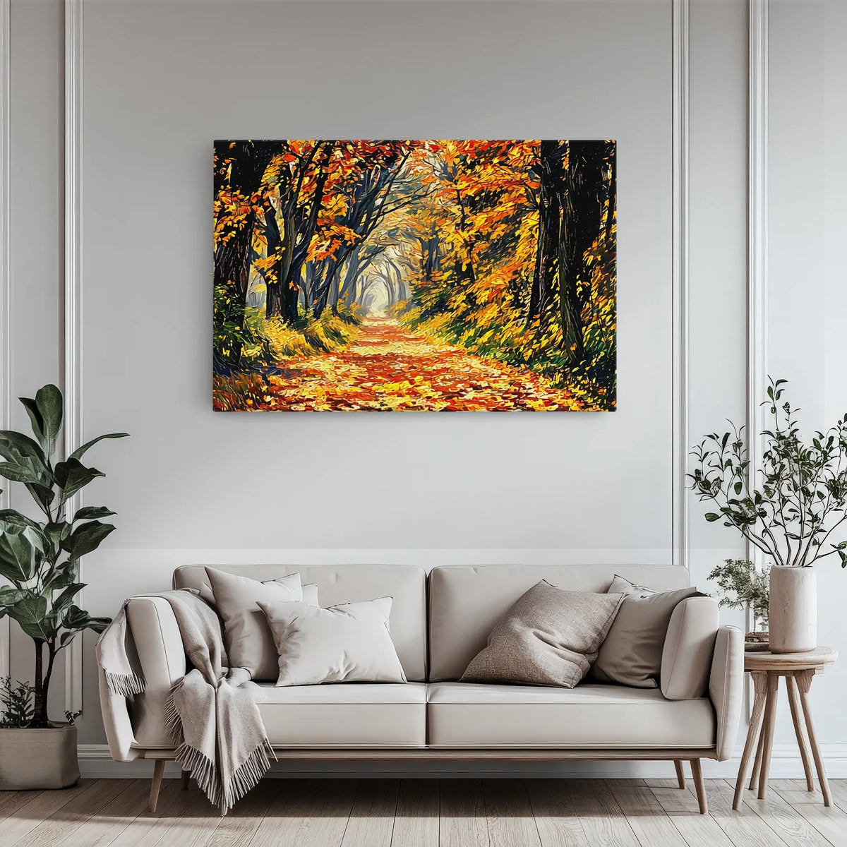 The exceptional quality of this print starts with its advanced features, designed to deliver a lasting visual experience. Each Autumn Forest Path Giclée Print 323001 is a high-quality Giclée print, which simply means it’s made using advanced inkjet technology that produces incredibly precise, vibrant colors and sharp details, just like you’d see in a high-end art gallery. We print on museum-quality polycotton canvas, weighing between 380gsm to 410gsm. This isn't just any canvas; it's a heavyweight, durable material that feels substantial and ensures your artwork looks rich and luxurious for years to come. For your convenience, the canvas is expertly stretched over a sturdy 1.5-inch pine wood frame and comes with a back wire, meaning it’s completely ready to hang the moment it arrives. No fuss, just Instant transformation. Prefer a different look? This artwork is also available as a Framed Print, printed on archival museum Fine Art Matte Paper, offering another elegant option to match your personal style.