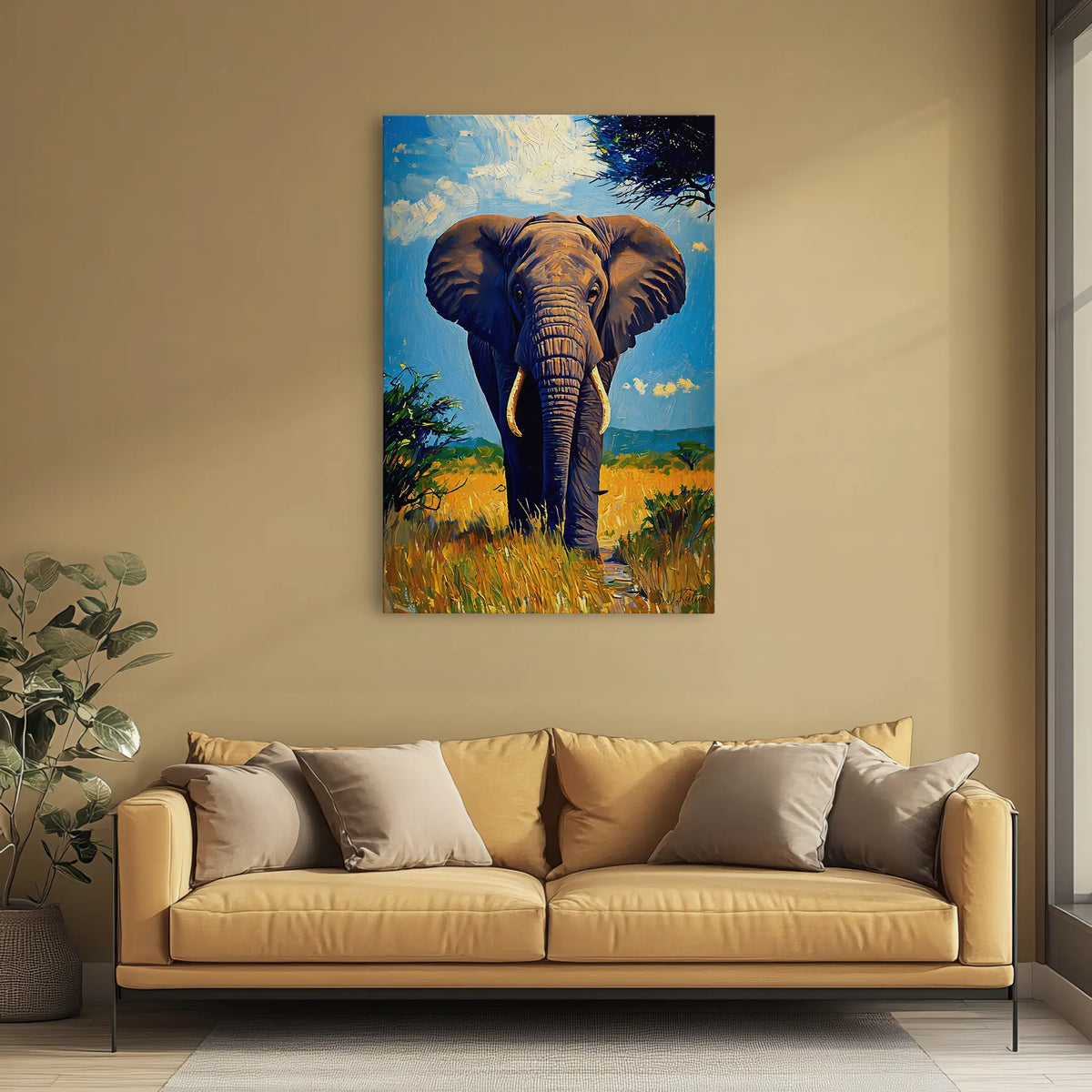 Blue-Sky Titan Elephant in the Grasslands Giclée Print 231007 - Giclée Stretched Canvas Print / 12x18in (30x45cm)