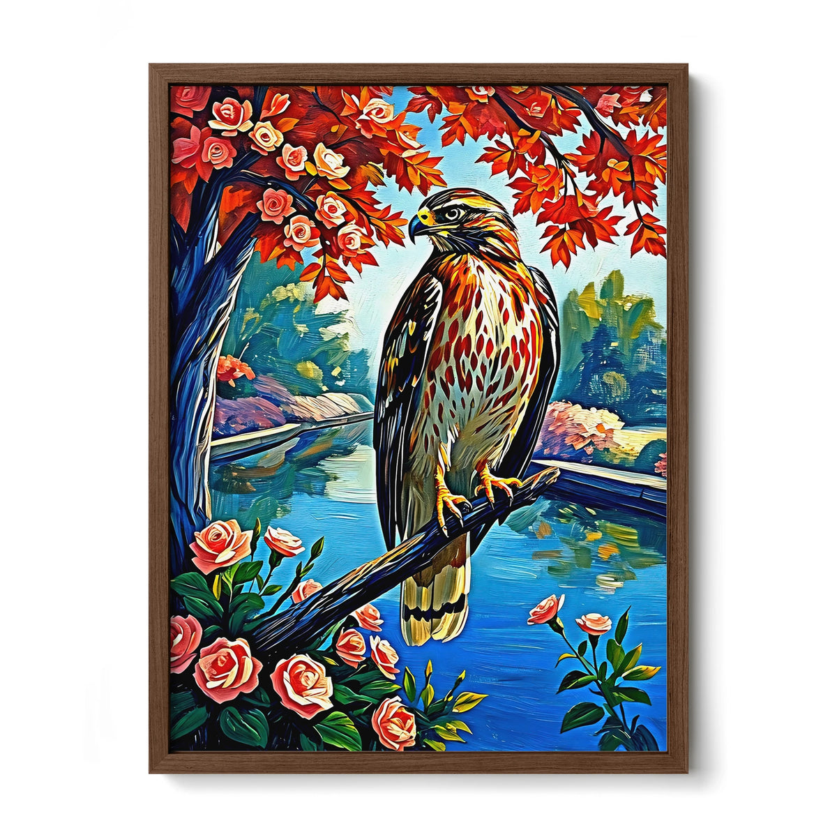 This stunning artwork captures a proud red-tailed hawk resting by a calm river, surrounded by vivid flowers and blazing red leaves.