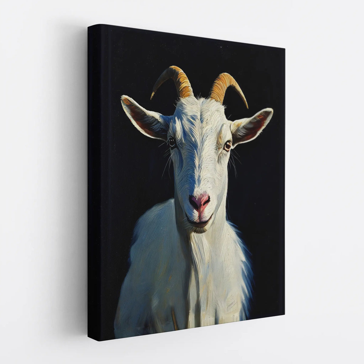 Visually, this print is a masterpiece. The image showcases a striking portrait of a white goat, its head turned slightly towards the viewer, as if offering a moment of quiet connection. The artist has masterfully rendered the goat's features, from the subtle texture of its woolly coat to the warm tones of its horns and the gentle pink of its nose. The play of light and shadow adds depth and dimension, making the subject appear almost three-dimensional. The rich, dark background serves to accentuate the goat's purity and presence, allowing its serene expression to truly shine. It’s a vision of understated majesty, an instant upgrade for any wall, offering a touch of nature's quiet grace.